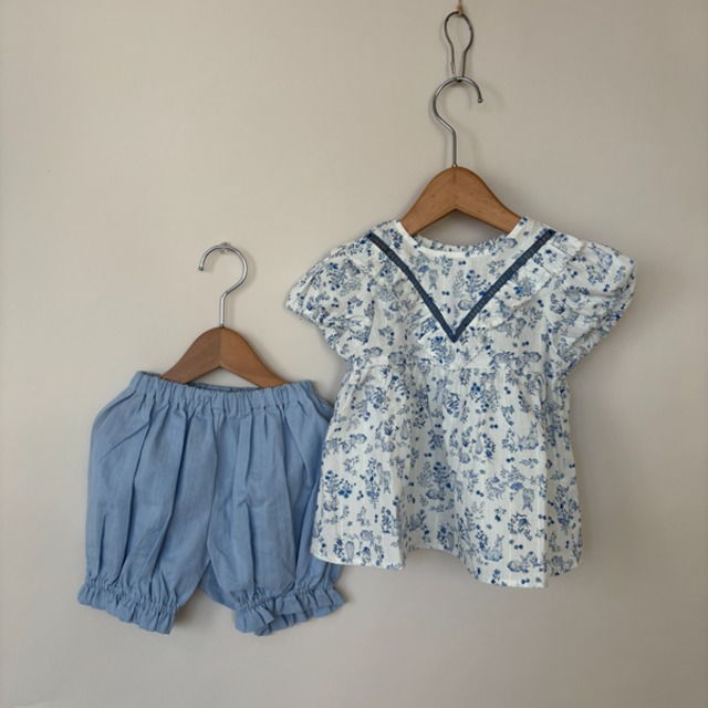 ヨーク部分にスモッキングをあしらったトップスと ダンガリー素材のボトムスのセットアップです 寒い季節は長袖トップスやタイツと合わせて着用していただけます material 本体 綿100% 洗濯機可
