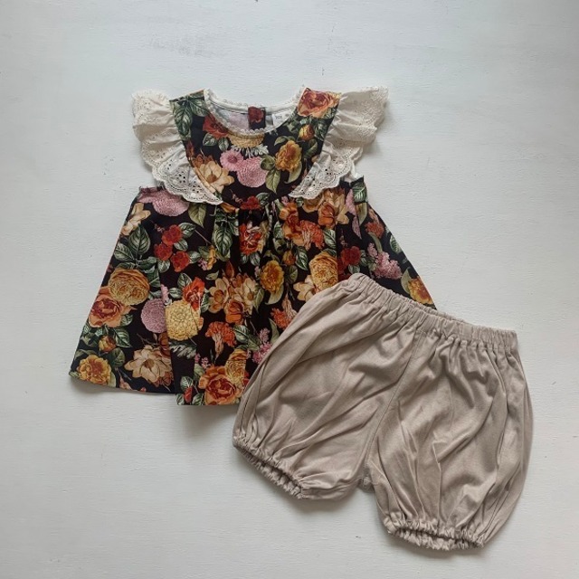 ハリ感のあるタイプライター生地を使用した トップスとブルマのセットアップです ヨーク部分の共素材のフリルがポイント 後ろ開き部分は小花柄がアクセントになっています ギフトにもおすすめです material 綿100% 洗濯機可